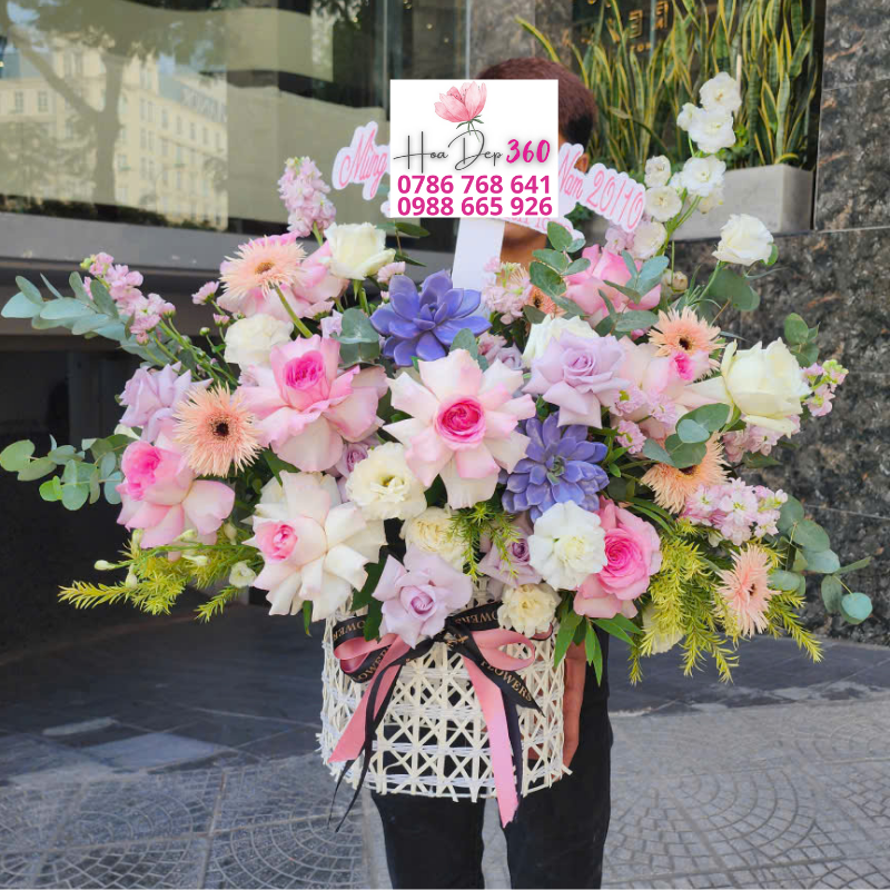 Giỏ hoa tươi phối sắc hồng – tím – trắng pastel sang trọng là món quà lý tưởng cho những ai yêu thích sự nhẹ nhàng, thanh lịch nhưng không kém phần nổi bật. Sự kết hợp tinh tế giữa hoa hồng pastel, hoa đồng tiền hồng nhạt, hoa cẩm chướng, hoa lan trắng cùng hoa tím lavender và lá phụ eucalyptus đã tạo nên một tổng thể hài hòa, lãng mạn và đầy cuốn hút.