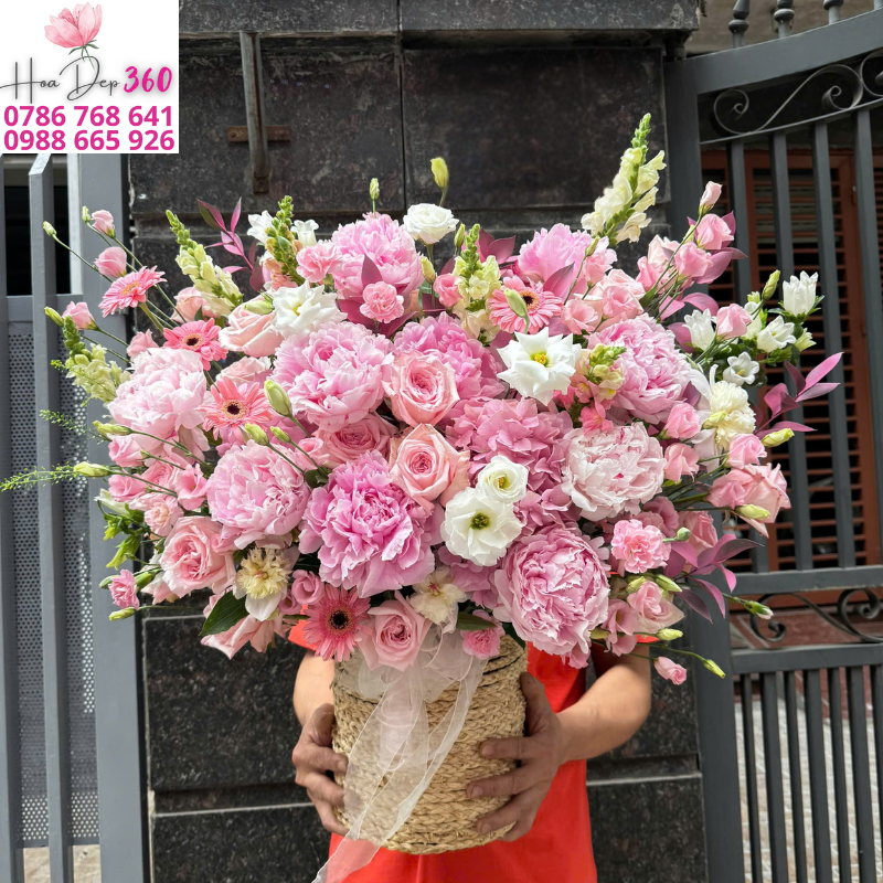 Giỏ hoa tươi tone hồng pastel mang đến vẻ đẹp lãng mạn, tinh tế và tràn đầy cảm xúc yêu thương. Được thiết kế trong giỏ mây tự nhiên thanh lịch, giỏ hoa là sự hòa quyện của hoa mẫu đơn hồng phấn, hoa hồng pastel, cẩm tú cầu hồng, hoa đồng tiền hồng, hoa lisianthus trắng tinh khôi cùng lá xanh nhẹ nhàng điểm xuyết.