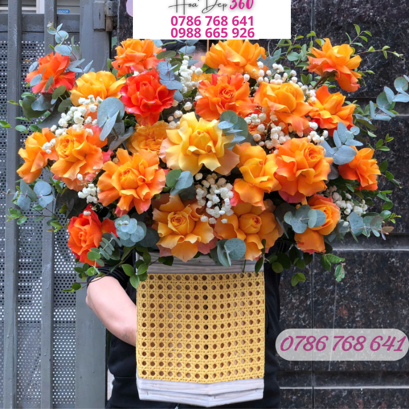 Giỏ hoa tươi tone cam – vàng mang đến vẻ đẹp rực rỡ, sang trọng và tràn đầy sức sống. Được thiết kế tinh tế trong giỏ mây vàng hiện đại, giỏ hoa là sự kết hợp nổi bật của hoa hồng vàng tươi, hoa hồng cam rực rỡ, hoa baby trắng thanh khiết và lá eucalyptus xanh mát.