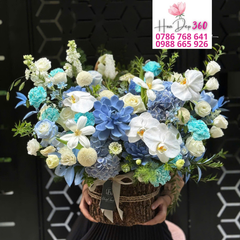 Giỏ hoa xanh – trắng cao cấp là một tuyệt phẩm nghệ thuật, mang đến vẻ đẹp thanh thoát, hiện đại và sang trọng bậc nhất. Với sự kết hợp tinh tế giữa hoa hồng trắng thuần khiết, lan hồ điệp trắng kiêu sa, cẩm tú cầu xanh dương dịu mát cùng những bông hoa điểm nhấn xanh ngọc độc đáo, giỏ hoa như một làn gió mới đầy tươi trẻ. Sắc xanh tượng trưng cho sự bình an, hy vọng và khởi đầu mới, trong khi sắc trắng lại gợi sự tinh khôi, trang nhã, rất thích hợp để làm quà tặng trong các dịp khai trương, khánh thành, kỷ niệm hoặc gửi tặng người thân, đối tác với thông điệp chúc phúc và may mắn.