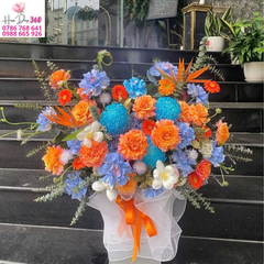 Không chỉ dừng lại ở sự phối màu ấn tượng, giỏ hoa còn được điểm xuyết bởi những nhành hoa phụ xanh lam nhẹ nhàng cùng lá bạc trang trí thanh thoát, khiến tổng thể trở nên mềm mại và hài hòa hơn. Sự phối hợp độc đáo giữa cam – xanh – trắng mang đến cảm giác vừa hiện đại, vừa tinh tế, phù hợp với nhiều không gian: từ phòng khách, văn phòng làm việc, cho đến những buổi tiệc sang trọng.