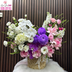 Giỏ hoa nghệ thuật với sự kết hợp tinh tế giữa các gam màu trắng – tím – hồng mang đến vẻ đẹp lãng mạn, ngọt ngào và đầy cuốn hút. Nổi bật trong giỏ hoa là những bông cúc tím tròn đầy, tượng trưng cho sự cao quý và thủy chung bền chặt. Xen lẫn là những cánh hoa lan hồ điệp tím sang trọng, tỏa sáng giữa nền hoa trắng thanh khiết và hoa hồng pastel nhẹ nhàng. Từng đóa hoa cẩm chướng, cát tường và địa lan hồng phấn được cắm xen kẽ khéo léo, tạo nên một bản hòa ca màu sắc đầy quyến rũ và hài hòa.