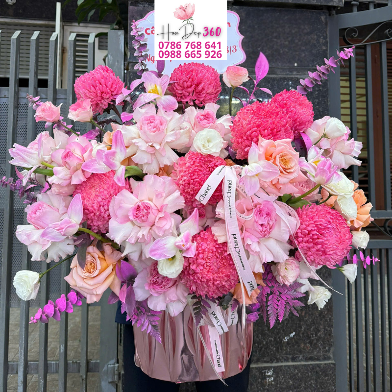 Giỏ hoa sang trọng với gam màu hồng rực rỡ – pastel nhẹ nhàng mang đến vẻ đẹp ngọt ngào, lãng mạn và đầy tinh tế. Nổi bật trong giỏ hoa là những đóa cúc mẫu đơn hồng tròn đầy kiêu sa, tượng trưng cho sự viên mãn, hạnh phúc và khởi đầu thuận lợi. Xen kẽ là những hoa hồng pastel và hoa lan hồng nhẹ nhàng, gợi nhắc đến sự ngọt ngào, tình yêu trong sáng và niềm hạnh phúc bền lâu.