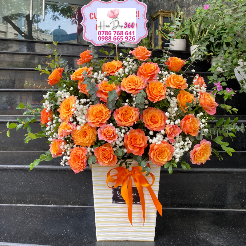 Màu cam của hoa hồng không chỉ mang đến cảm giác ấm áp, tươi vui mà còn tượng trưng cho may mắn, thịnh vượng và những khởi đầu tốt đẹp. Chính vì vậy, giỏ hoa hồng cam rực rỡ đặc biệt phù hợp trong các dịp khai trương, chúc mừng sinh nhật, kỷ niệm, thăng chức hay các sự kiện quan trọng. Đây không chỉ là món quà trang nhã mà còn là lời chúc ý nghĩa, gửi đi sự động viên và khích lệ tinh thần mạnh mẽ.