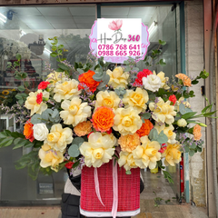 Giỏ hoa hồng vàng – cam tươi sang trọng là sự kết hợp hoàn mỹ giữa sắc vàng rực rỡ, sắc cam ấm áp và điểm xuyết những gam trắng tinh khôi, tạo nên một tổng thể nổi bật và cuốn hút. Những đóa hoa hồng vàng bung nở tươi sáng – biểu tượng của niềm vui, sự may mắn và tình bạn chân thành, hòa quyện cùng hoa hồng cam rực rỡ – đại diện cho niềm nhiệt huyết, sự thành công và hạnh phúc viên mãn. Xen kẽ trong đó là hoa hồng trắng, cẩm chướng cam, hoa tím nhỏ nhắn và lá bạc eucalyptus xanh mát, giúp giỏ hoa trở nên hài hòa, tinh tế và đầy sức sống.