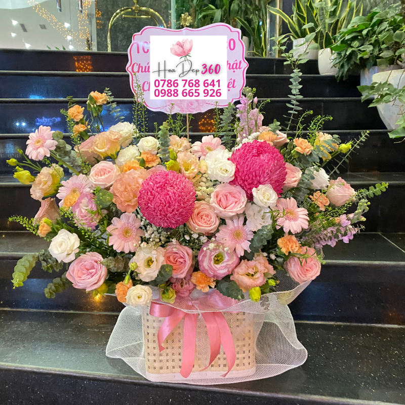 Giỏ hoa được đặt trong giỏ mây cao cấp, trang trí thêm chiếc nơ hồng mềm mại và lớp voan trắng nhẹ nhàng, giúp sản phẩm toát lên vẻ sang trọng và hiện đại. Đây là mẫu hoa lý tưởng cho nhiều dịp đặc biệt: sinh nhật, kỷ niệm, lễ tình nhân, 8/3, 20/10, ngày cưới hoặc những dịp cần gửi lời chúc mừng, tri ân đối tác, khách hàng.