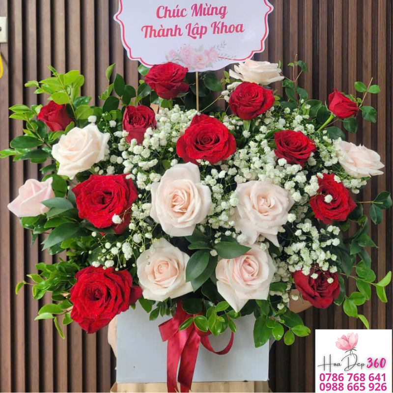 Được điểm xuyết bằng hoa baby trắng tinh khôi và những cành lá xanh mướt, giỏ hoa tạo nên sự tươi mới, tinh tế và hiện đại. Đặt trong hộp hoa trắng sang trọng, thắt nơ đỏ nổi bật, mẫu hoa này vô cùng phù hợp để gửi gắm lời chúc mừng trang trọng trong các dịp đặc biệt như: khai trương, kỷ niệm, thành lập công ty, thành lập khoa, sinh nhật hoặc chúc mừng thăng chức.