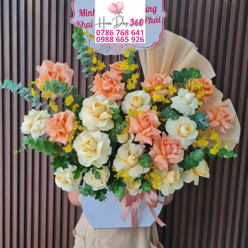 Giỏ hoa hồng kem – cam đào khai trương là một thiết kế hoa tươi sang trọng và đầy ý nghĩa, mang trong mình thông điệp về sự khởi đầu may mắn, tài lộc và thịnh vượng. Sự kết hợp hài hòa giữa hoa hồng kem tinh khôi – biểu tượng của sự thanh lịch, nhẹ nhàng, cùng những đóa hồng cam đào rực rỡ – tượng trưng cho nhiệt huyết, thành công và năng lượng tích cực, tạo nên một tổng thể tươi sáng và cuốn hút.