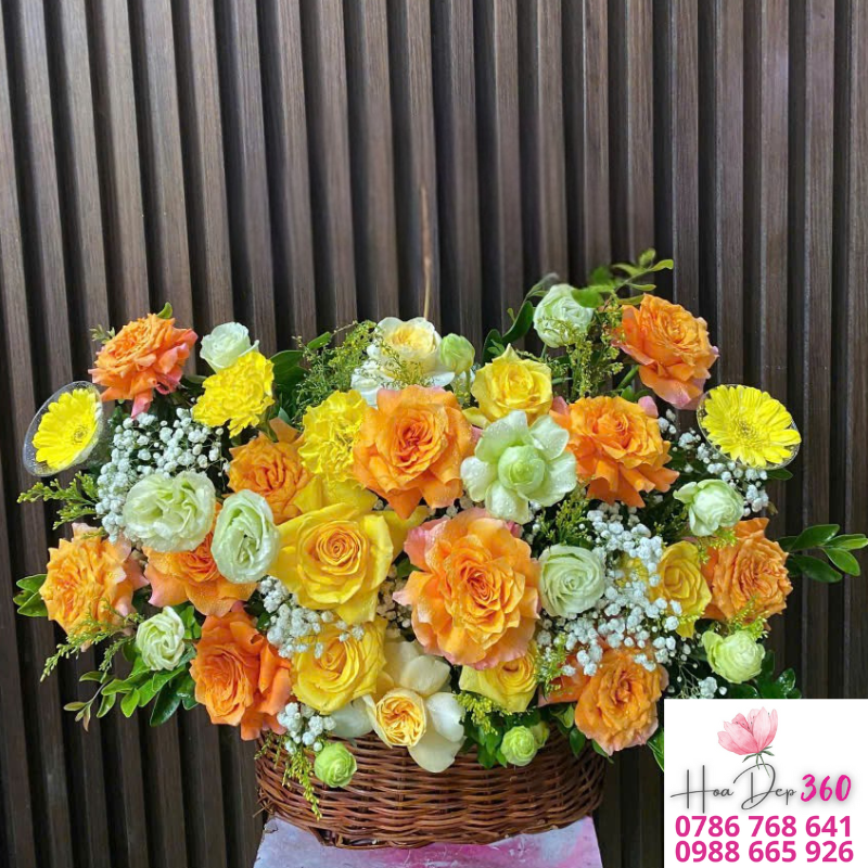 Giỏ hoa hồng vàng – cam tươi sáng không chỉ là món quà ý nghĩa mà còn thích hợp để trang trí không gian sự kiện, văn phòng, khách sạn, nhà hàng hoặc phòng khách, mang lại sự rạng ngời, tươi mới và sang trọng.