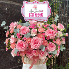 Giỏ hoa hồng phấn – cẩm chướng ngọt ngào là sự kết hợp tinh tế giữa sắc hồng lãng mạn, nhẹ nhàng và sự duyên dáng, tươi tắn. Những đóa hồng phấn kiêu sa mang thông điệp của tình yêu ngọt ngào, sự dịu dàng và những lời chúc hạnh phúc viên mãn. Xen kẽ trong đó là những bông cẩm chướng hồng và hồng nhạt – biểu trưng cho sự may mắn, lòng biết ơn và tình cảm chân thành. Tất cả cùng hòa quyện trong một giỏ hoa sang trọng, đầy sức sống.