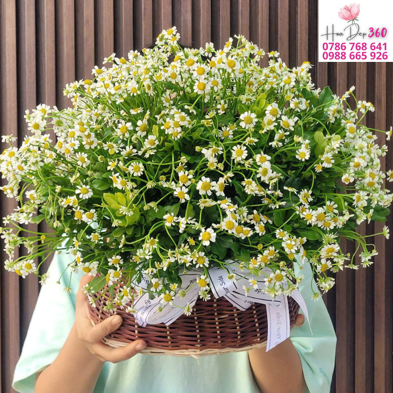 Giỏ hoa cúc họa mi tinh khôi mang trong mình vẻ đẹp giản dị, mộc mạc nhưng đầy sức hút. Với những đóa cúc họa mi trắng nhỏ nhắn, xinh xắn và nhụy vàng tươi rạng rỡ, giỏ hoa gợi nhắc đến sự thuần khiết, trong sáng và niềm vui bình dị của cuộc sống. Cúc họa mi từ lâu đã được yêu thích bởi vẻ đẹp nhẹ nhàng, gần gũi, là biểu tượng của tình yêu thầm lặng, sự gắn bó và niềm hạnh phúc giản đơn.