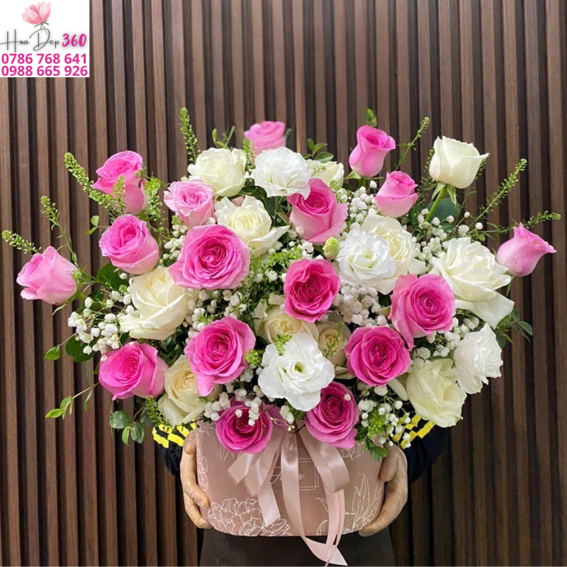 Giỏ hoa hồng hồng – trắng sang trọng là sự kết hợp hoàn hảo giữa hai sắc hoa thanh khiết và rực rỡ. Những đóa hồng hồng tươi thắm tượng trưng cho tình yêu ngọt ngào, sự lãng mạn và niềm vui trong cuộc sống. Xen kẽ cùng đó là những đóa hồng trắng tinh khôi, biểu trưng cho sự thuần khiết, chân thành và những khởi đầu mới đầy hy vọng.