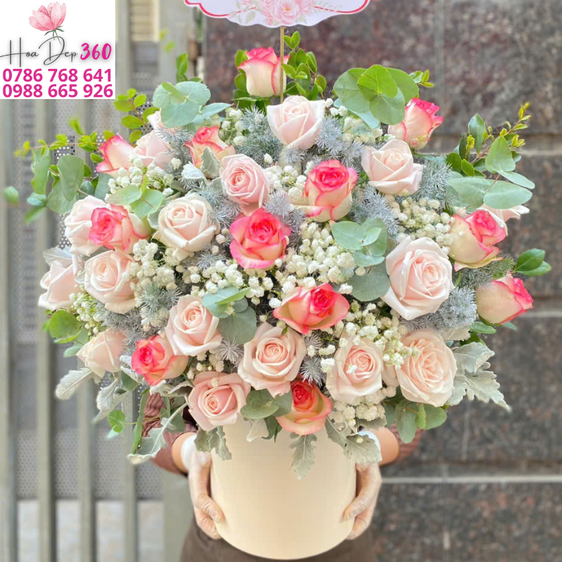 Bên cạnh những cành hồng kiêu sa, giỏ hoa còn được điểm xuyết bởi baby trắng nhỏ xinh, lá bạc sang trọng và lá xanh eucalyptus hiện đại, tất cả tạo nên một tổng thể hài hòa, lãng mạn và đầy tính nghệ thuật.