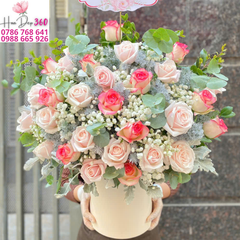 Giỏ hoa hồng kem phối hồng sen là sự kết hợp hoàn hảo giữa vẻ đẹp ngọt ngào, tinh khôi và sang trọng. Với gam màu chủ đạo là hồng pastel nhẹ nhàng xen lẫn hồng sen rực rỡ, giỏ hoa toát lên thần thái vừa dịu dàng, vừa nổi bật, thích hợp làm quà tặng trong nhiều dịp đặc biệt.