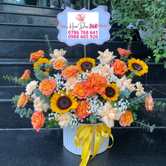 Sắc vàng của hướng dương tượng trưng cho niềm tin, hy vọng và hạnh phúc, kết hợp cùng sắc cam tươi trẻ – biểu tượng của sự nhiệt huyết, thành công và may mắn. Xen kẽ vào đó là hoa hồng kem nhẹ nhàng, tinh tế, tạo nên sự cân bằng hoàn hảo giữa rực rỡ và thanh lịch. Đây không chỉ là một giỏ hoa đơn thuần, mà còn là lời chúc phúc tốt đẹp, thay cho những thông điệp tích cực mà bạn muốn gửi đến người thân yêu, bạn bè, đồng nghiệp hay đối tác.