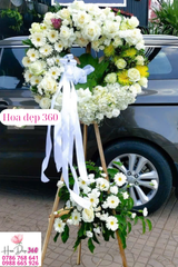 Kệ hoa chia buồn 2 tầng với vòng hoa trắng tinh khôi mang ý nghĩa tưởng nhớ và tiễn đưa trang trọng: