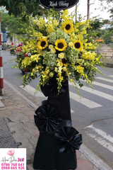 Tầng trên: Hoa hướng dương vàng tươi nổi bật ở vị trí trung tâm, bao quanh bởi hoa lan vàng, hoa hồng vàng và những cụm hoa trắng nhẹ nhàng. Sự xen kẽ giữa vàng và trắng tạo nên một tổng thể ấm áp, đầy sức sống nhưng vẫn giữ nét trang trọng.