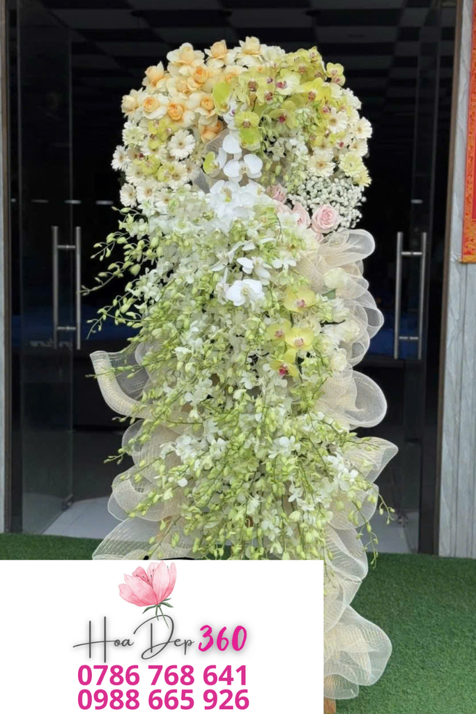 Kệ hoa chia buồn được thiết kế theo kiểu dáng thác hoa rủ mềm mại và sang trọng, tạo cảm giác thanh thoát, trang nghiêm: