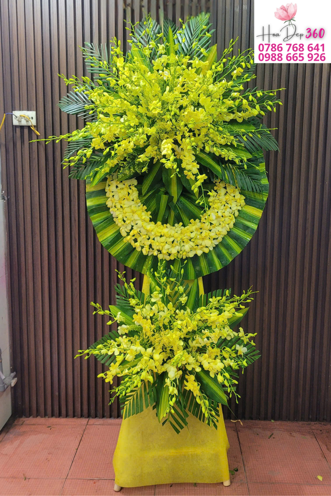 Kệ hoa được thiết kế 2 tầng theo phong cách đối xứng nhưng sáng tạo, nổi bật với điểm nhấn là vòng hoa cách điệu từ lá xanh độc đáo, kết hợp hài hòa với hoa lan vàng – biểu tượng của sự kính trọng và lời tiễn biệt trang nhã.