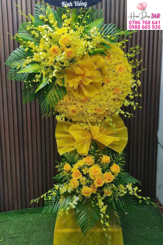 Điểm nhấn là vòng hoa tròn lớn phủ đầy hoa cúc vàng, được viền bằng lá thiết mộc lan xanh đậm, tạo nên sự nổi bật và hài hòa.