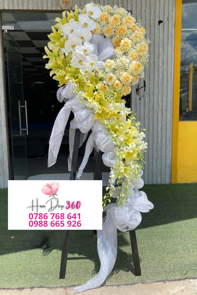 Vòng hoa chính gồm các loại hoa hồng vàng kem, cúc trắng, cùng điểm xuyết hoa lan vàng nhạt tạo nên vẻ đẹp nhẹ nhàng, ấm áp mà không kém phần trang nghiêm.