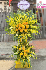 Đây là một kệ hoa chia buồn – kính viếng, được thiết kế trang nhã và trang trọng với tông vàng chủ đạo, biểu tượng cho sự tưởng nhớ và lòng thành kính: