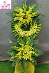 Vòng hoa tròn kết hợp hoa lan vàng mang ý nghĩa về sự luân hồi, trường tồn và lời tiễn biệt trang nghiêm.