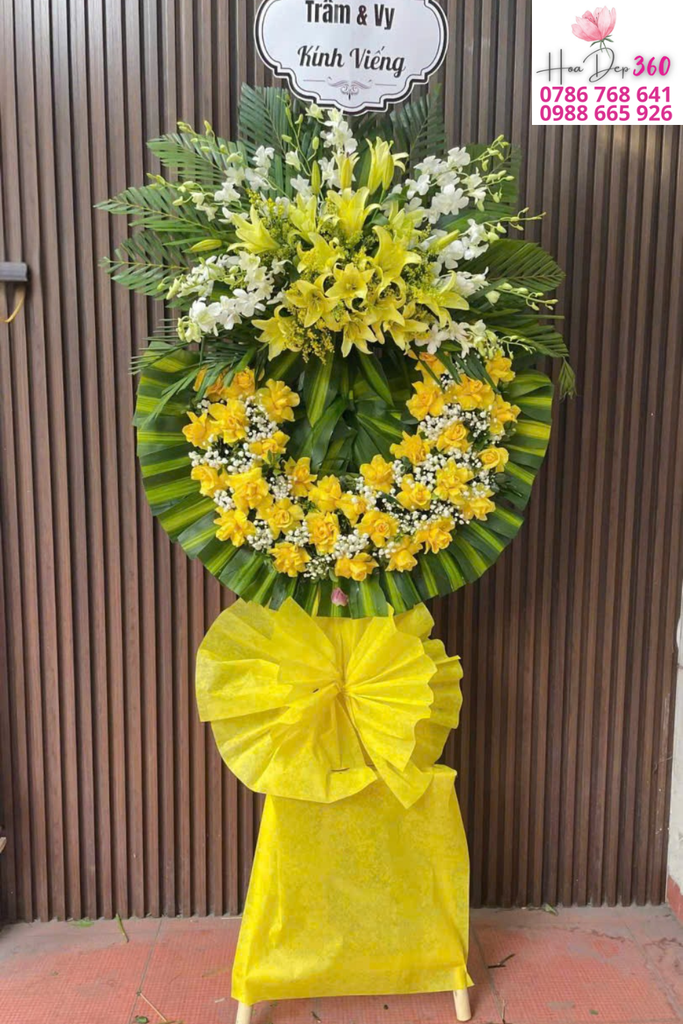 Sự kết hợp giữa sắc trắng và vàng không chỉ biểu trưng cho lòng tiếc thương, mà còn thể hiện sự tôn kính và lời tiễn biệt thanh thản đến người đã khuất. Thiết kế vòng hoa tròn tượng trưng cho sự vĩnh hằng, chu toàn và lòng thành kính sâu sắc của người gửi.