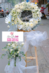 Hoa chính: Hoa cúc trắng, hoa hồng trắng, lan hồ điệp trắng và các loại hoa nhỏ trắng tạo thành vòng tròn tinh tế.