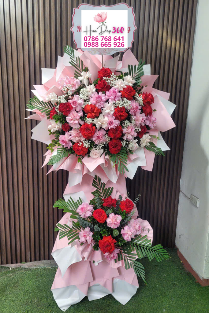 Kệ hoa khai trương 2 tầng phối sắc đỏ – hồng – trắng đầy tinh tế: