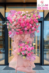 "Hoa Khai Trương Xuân Hồng Phú Quý" là mẫu hoa khai trương cao cấp, phối hợp tinh tế giữa các loài hoa hồng o’hara kiêu sa, hồng lạc thần quyến rũ, cúc mẫu đơn hồng sang trọng, đồng tiền hồng may mắn, lan mõm sói hồng thanh thoát, lan tường hồng mềm mại, hoa phăng hồng rực rỡ, điểm xuyết baby trắng tinh khôi, lá trầu bà xanh mát và lá bạc trang nhã.Sắc hồng chủ đạo không chỉ mang lại cảm giác ấm áp, nhẹ nhàng mà còn là biểu tượng của sự thịnh vượng và thành công, rất thích hợp để gửi tặng đối tác, khách hàng hoặc bạn bè trong dịp khai trương, mở cửa hàng, khởi nghiệp.