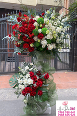 Hoa Khai Trương Phát Tài Phú Quý là kệ hoa rực rỡ, kết hợp tông màu đỏ – trắng – xanh tượng trưng cho may mắn, thịnh vượng và khởi đầu thuận lợi. Sản phẩm gồm hoa hồng Ecuador sang trọng, hồng trắng tinh khiết, cúc mẫu đơn xanh – trắng tươi mới, đồng tiền đỏ trắng rực rỡ, hoa mao lương đỏ, lan tường xanh mát mắt, hoa baby, lan tiên, hoa mõm sói trắng, kết hợp cùng lá trầu bà, lá bạc, lá tai voi tạo nên tổng thể hài hòa, hiện đại mà vẫn ấm áp.