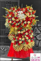 Kệ hoa khai trương thiết kế một tầng lớn, rực rỡ với sự kết hợp tinh tế giữa nhiều loại hoa và màu sắc nổi bật.