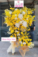 Tầng trên: Nổi bật với hoa hồng vàng O’hara cao cấp, hoa pingpong trắng, cúc mẫu đơn vàng, hoa đồng tiền vàng cùng cụm lan vũ nữ bay bổng. Xen giữa là nhành lan hồ điệp trắng sang trọng, tạo sự cân bằng tinh tế.