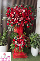 Kệ hoa khai trương với tông đỏ quyền lực kết hợp nhẹ nhàng sắc hồng phấn, tạo nên sự nổi bật và sang trọng: