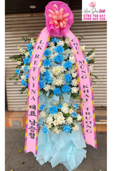 Kệ hoa khai trương nổi bật với tông màu xanh dương – trắng thanh lịch, phối hợp cùng sắc hồng từ ruy băng và nơ trang trí: