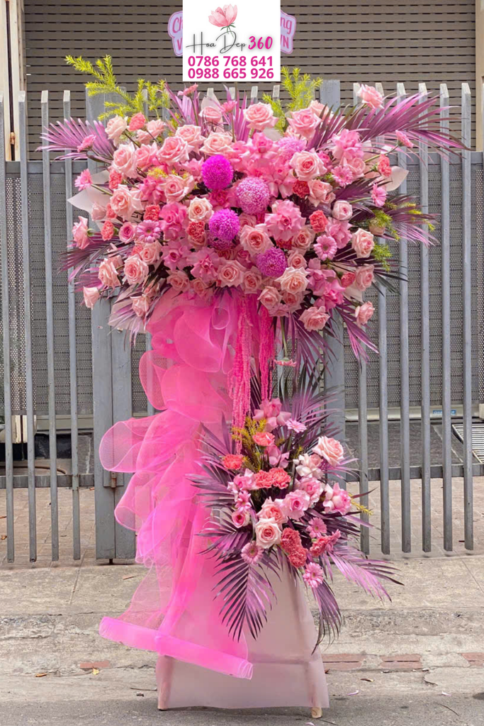Kệ hoa khai trương ngập tràn sắc hồng nổi bật, thiết kế bắt mắt và tràn đầy năng lượng:
