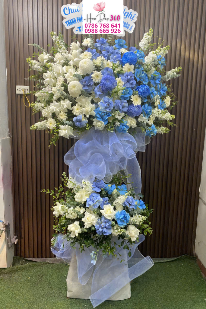 Kệ hoa khai trương với tông màu xanh dương trắng chủ đạo, mang phong cách hiện đại và tinh tế: