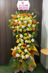 Kệ hoa khai trương tươi sáng, nổi bật với tông màu vàng cam trắng rạng rỡ, mang đậm tinh thần chúc mừng và lan tỏa năng lượng tích cực: