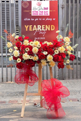 Kệ hoa chúc mừng sang trọng với tông màu đỏ – kem – vàng nhạt, được thiết kế dạng ngang độc đáo trên chân gỗ, tạo điểm nhấn hiện đại và đẳng cấp: