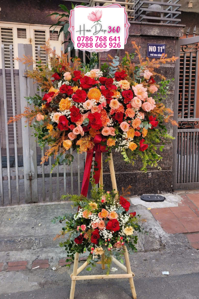 Kệ hoa khai trương nổi bật với tông màu đỏ cam hồng đào hòa quyện, mang lại cảm giác rực rỡ nhưng vẫn tinh tế, sang trọng: