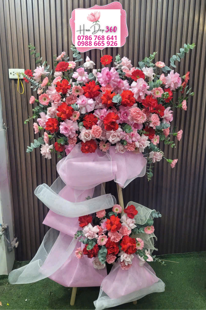 Kệ hoa khai trương ngọt ngào, nổi bật với tông màu hồng – đỏ – hồng pastel, mang lại cảm giác vừa lãng mạn, vừa rực rỡ, thu hút mọi ánh nhìn: