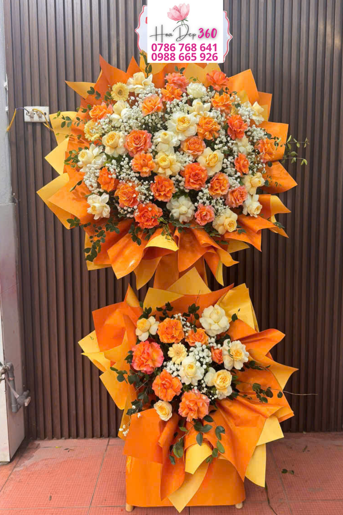 Kệ hoa khai trương hai tầng rực rỡ, nổi bật với sự kết hợp giữa sắc cam – vàng – trắng trên nền giấy gói cam nổi bật, mang đến cảm giác tươi vui, tràn đầy năng lượng.