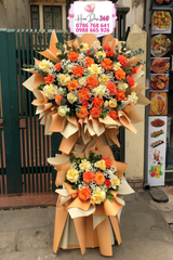 Kệ hoa khai trương thiết kế hai tầng tinh tế, nổi bật với gam màu cam cháy – vàng kem – trắng mang vẻ đẹp hiện đại, tươi sáng nhưng không kém phần sang trọng.
