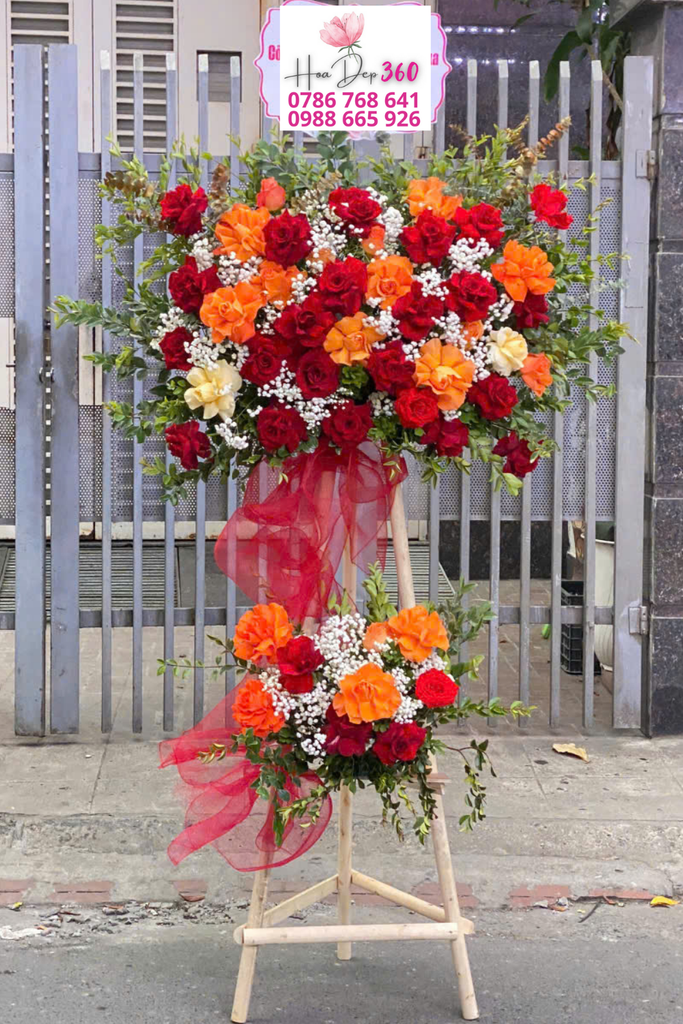 Kệ hoa khai trương được thiết kế hai tầng nổi bật, sử dụng tông đỏ – cam rực rỡ làm chủ đạo, mang đến cảm giác mạnh mẽ, thu hút và tràn đầy khí thế ngày khai trương.