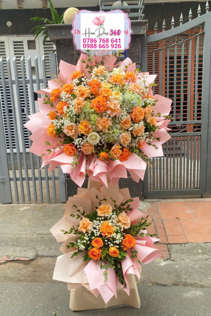 Kệ hoa khai trương được thiết kế hai tầng nổi bật, phối màu cam – kem rực rỡ, thể hiện sự tươi vui và hưng thịnh trong dịp khai trương.
