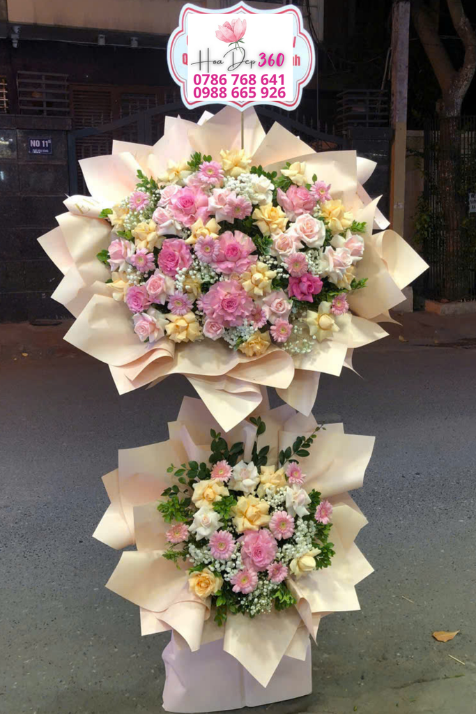 Sắc hồng – kem – vàng: Hài hòa, trang nhã, gửi gắm lời chúc khai trương thuận lợi, kinh doanh phát đạt, tương lai rực rỡ.