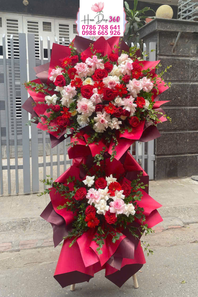 Kệ hoa khai trương 2 tầng với tone đỏ hồng nổi bật, mang khí thế rực rỡ và sang trọng: