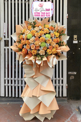 Hoa chính: Hồng cam, hồng vàng, kết hợp cùng hoa cúc mẫu đơn xanh cốm.