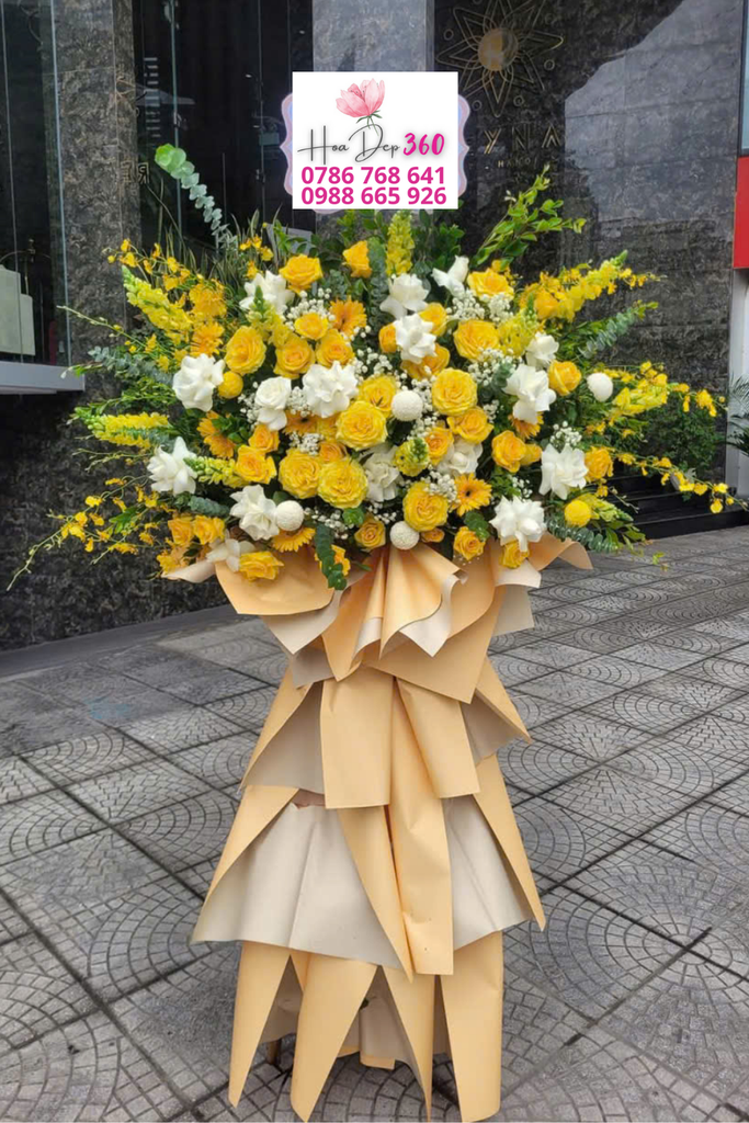 Hoa chính: Hồng vàng rực rỡ, lan vàng tươi, điểm thêm hồng trắng thanh nhã.